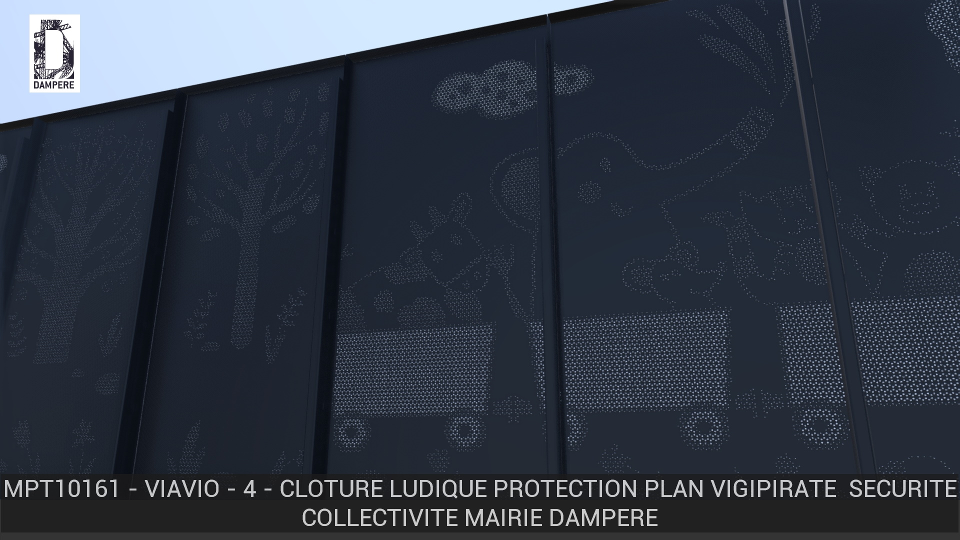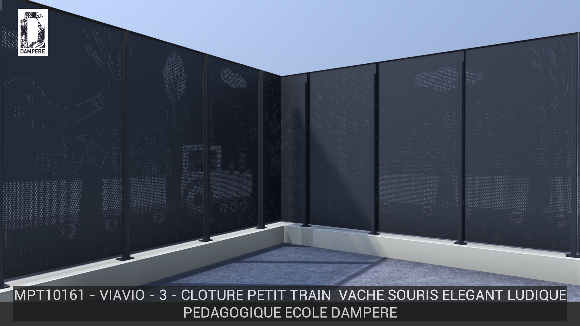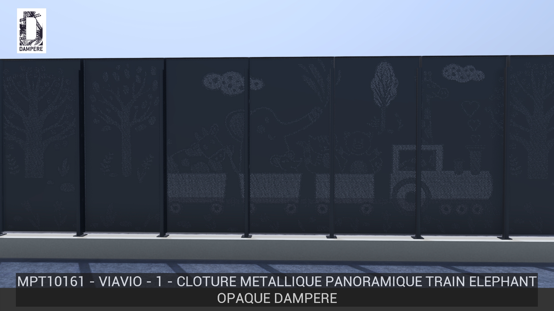 La clôture Viavio de DAMPERE présente un petit train qui voyage dans un paysage créé dans l’imaginaire d’un enfant, un dessin drôle montrant l’amitié d’un éléphant et d’une souris accompagné d’une vache et d’un chat sur une tôle micro perforée.
