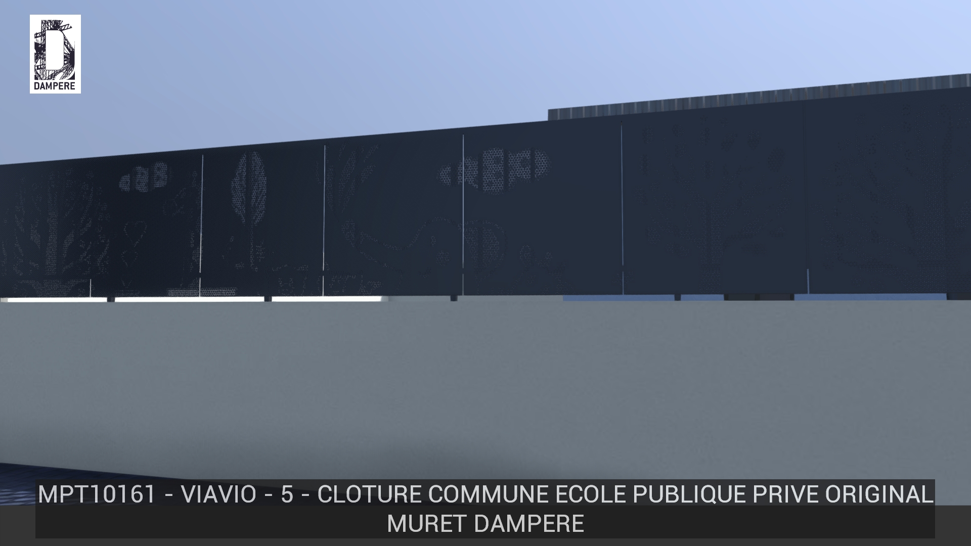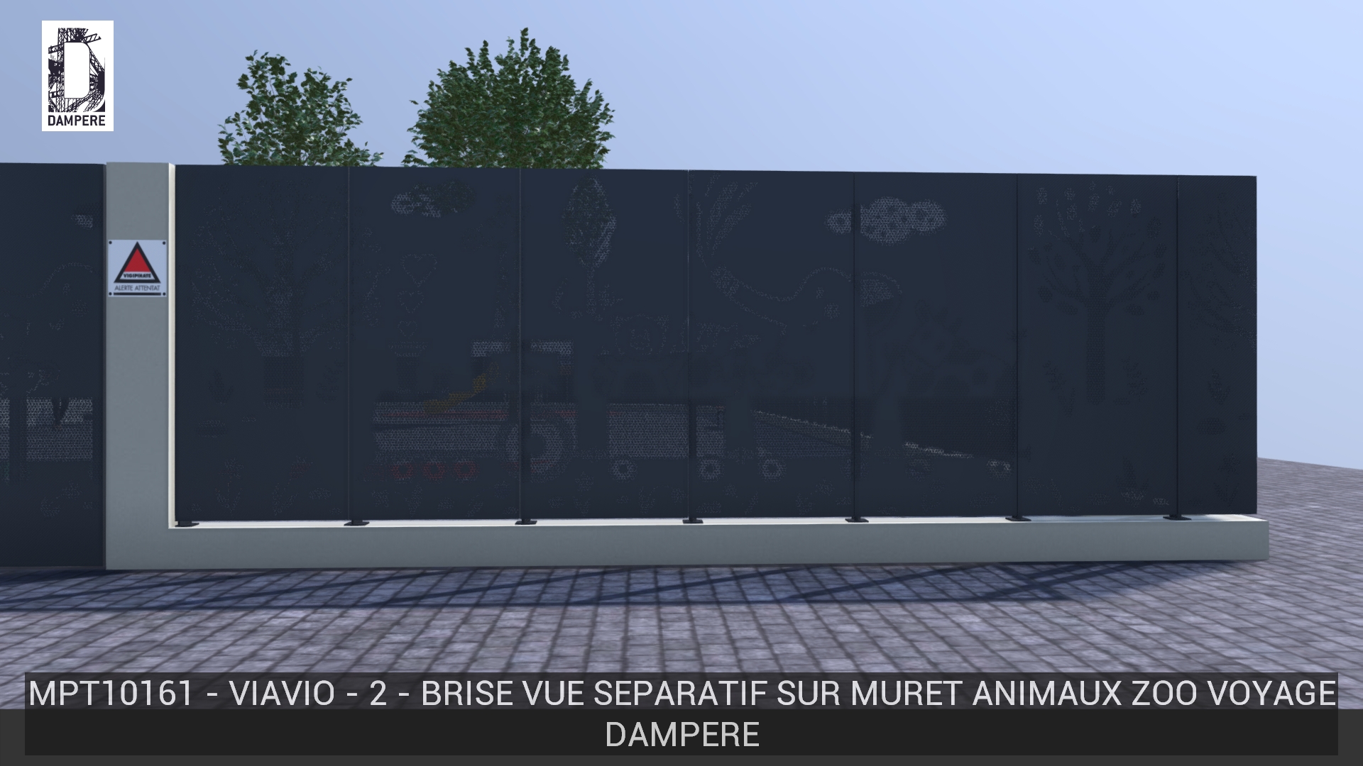 La clôture évoque un paysage lyrique reproduit par la technique de la Trame-pixel, les figures animales se profilent avec légèreté, les traits délicats reconstituent les formes sans donner trop de transparence au brise vue servant de barrière métallique.