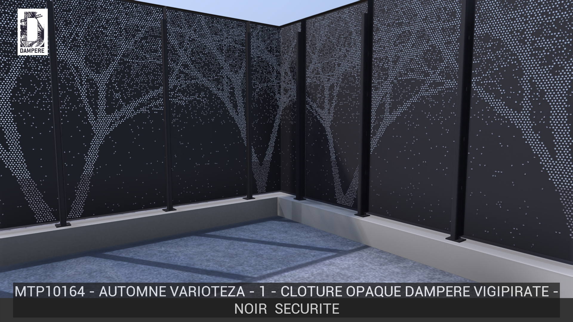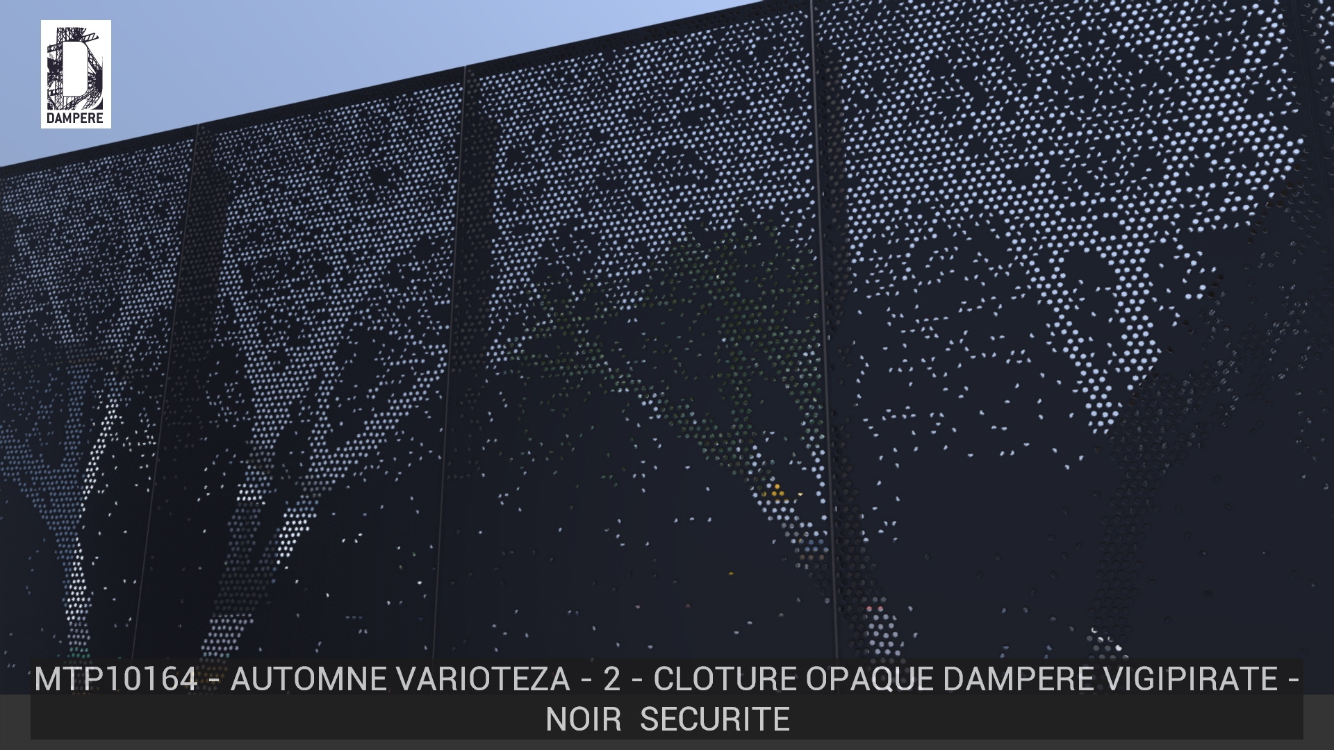 La clôture Automne Varioteza de DAMPERE dessine une silhouette d’arbre accompagné de feuilles tombantes en utilisant des perforations en pentagones asymétriques pour accentuer l’effet abstrait. Contraste élevé grâce au gradient du haut en branchages fluides vers le bas progressivement plein.