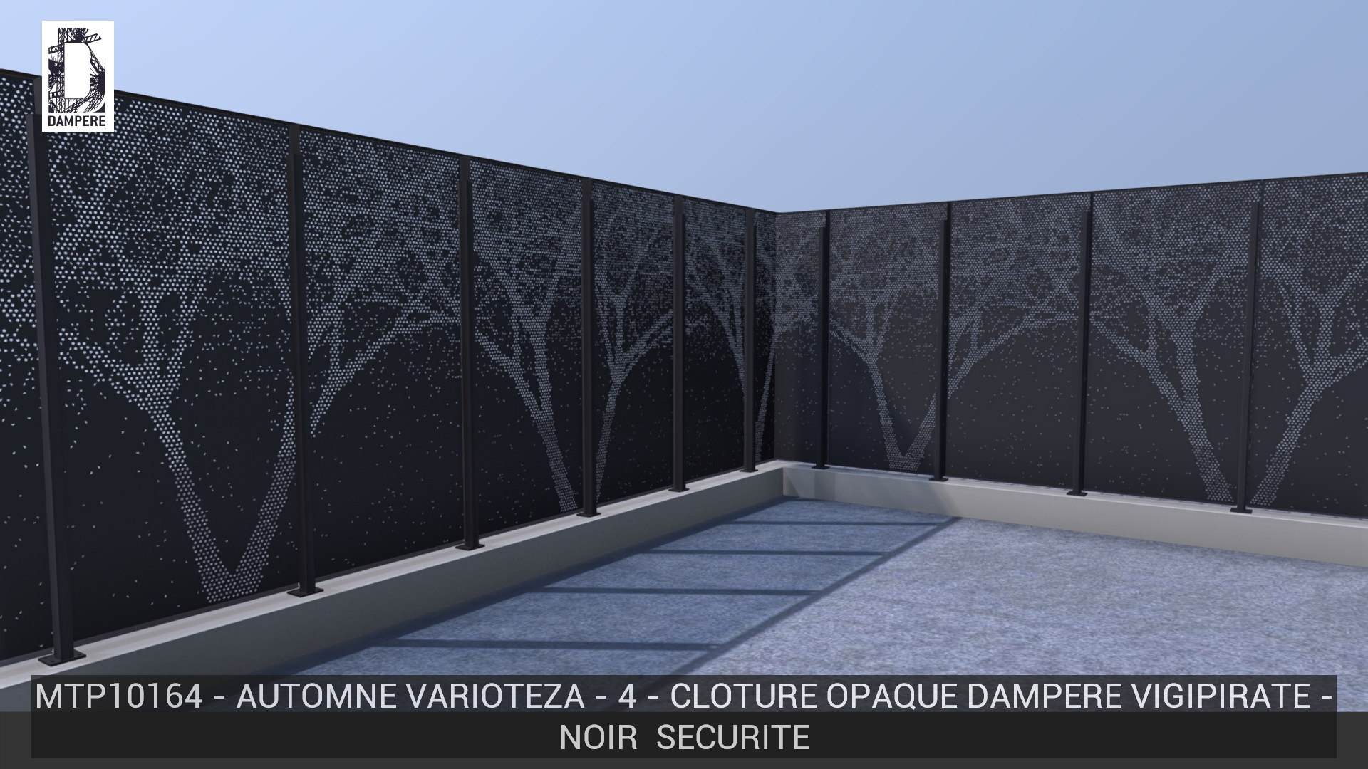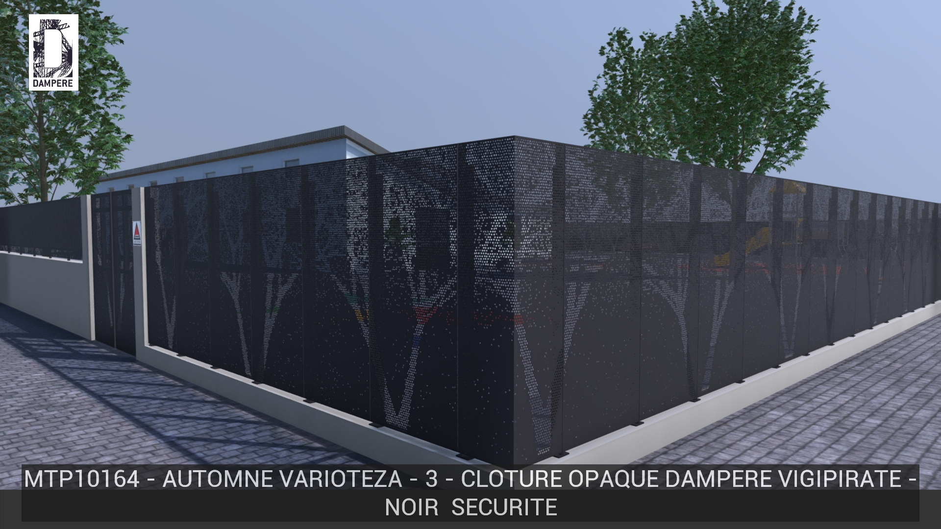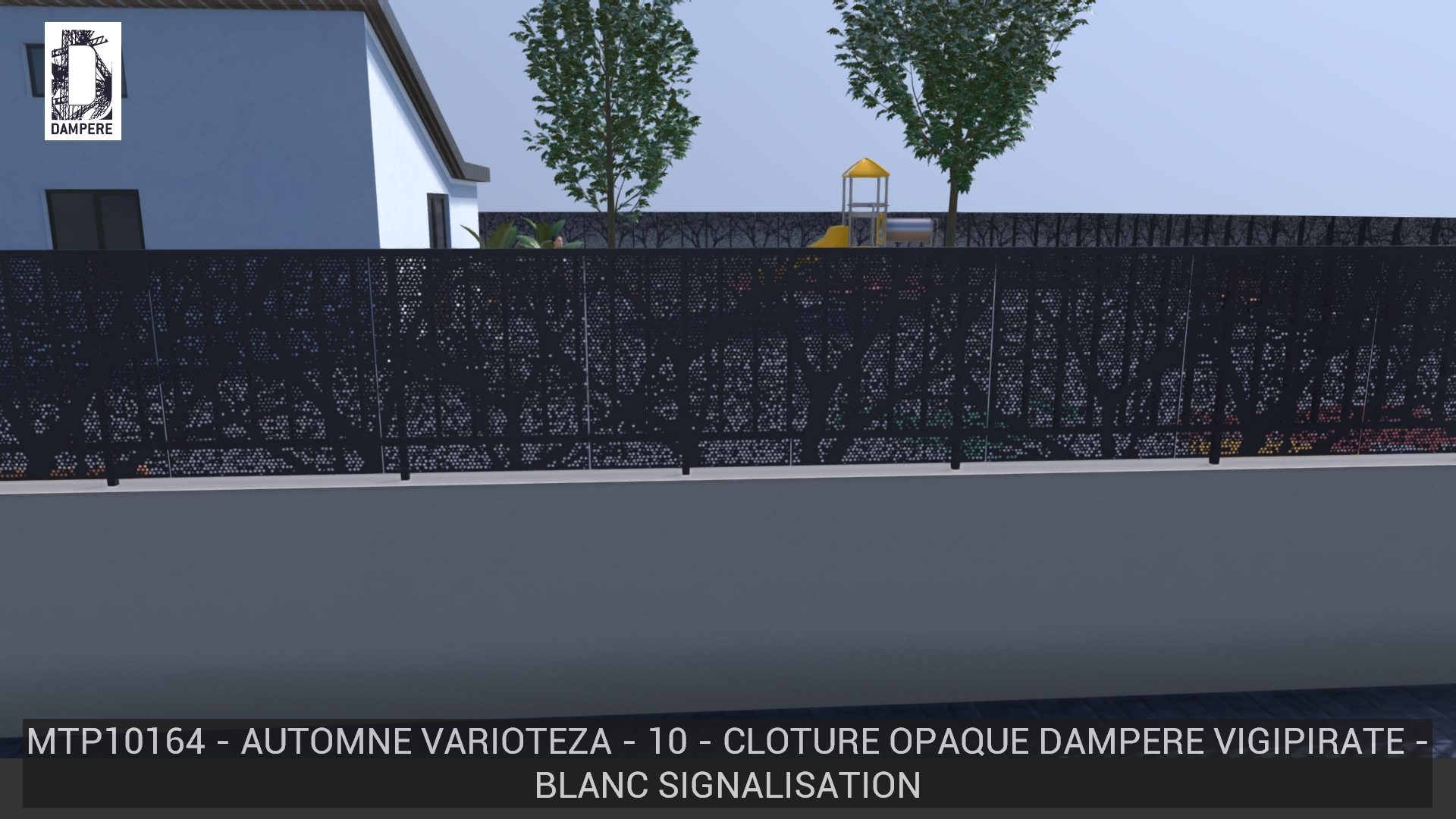 La clôture montre des arbres dont la transparence se limite au branchage volumineux, les troncs sont légèrement perforés pour réduire le passage du regard, rendant la partie basse presque opaque. L’effet de feuilles effritées accompagne la transition de transparence.