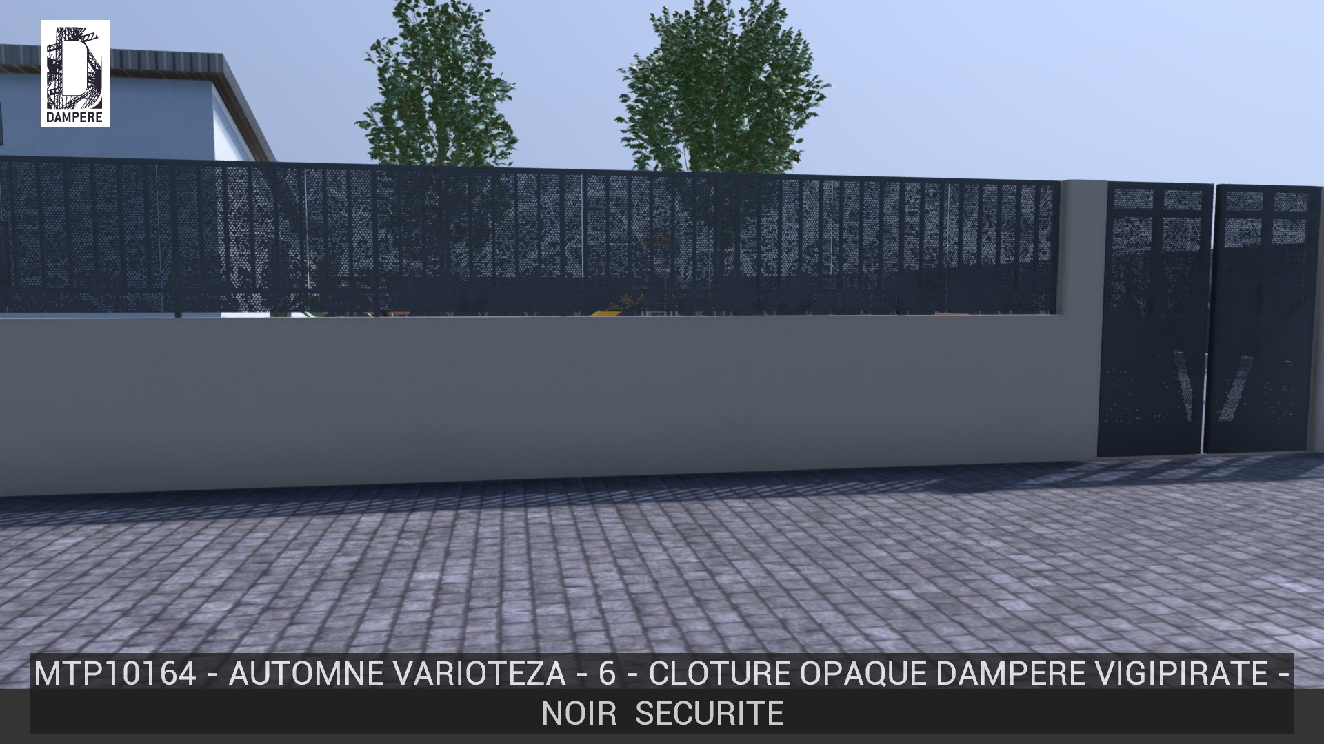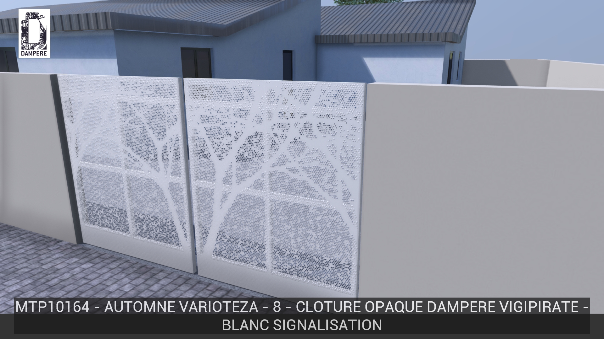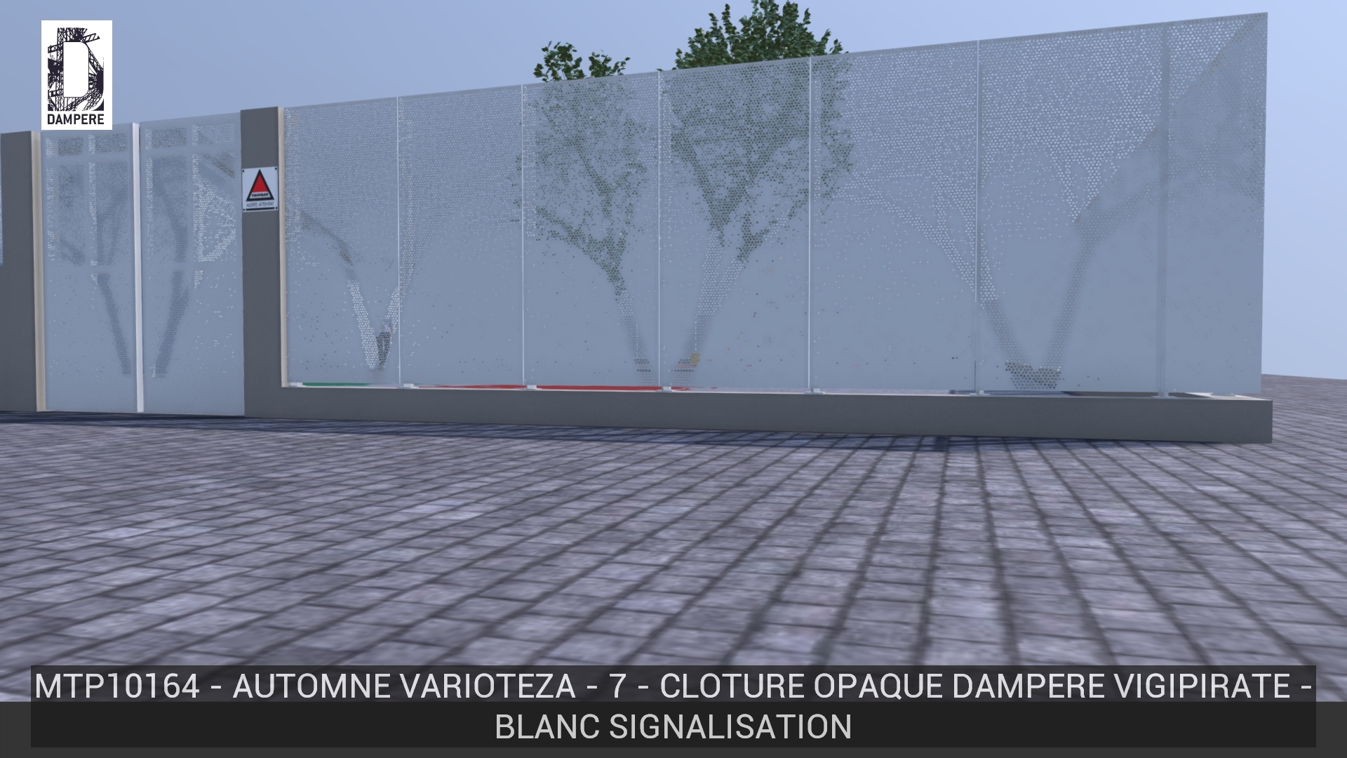 La clôture montre des arbres dont la transparence se limite au branchage volumineux, les troncs sont légèrement perforés pour réduire le passage du regard, rendant la partie basse presque opaque. L’effet de feuilles effritées accompagne la transition de transparence.