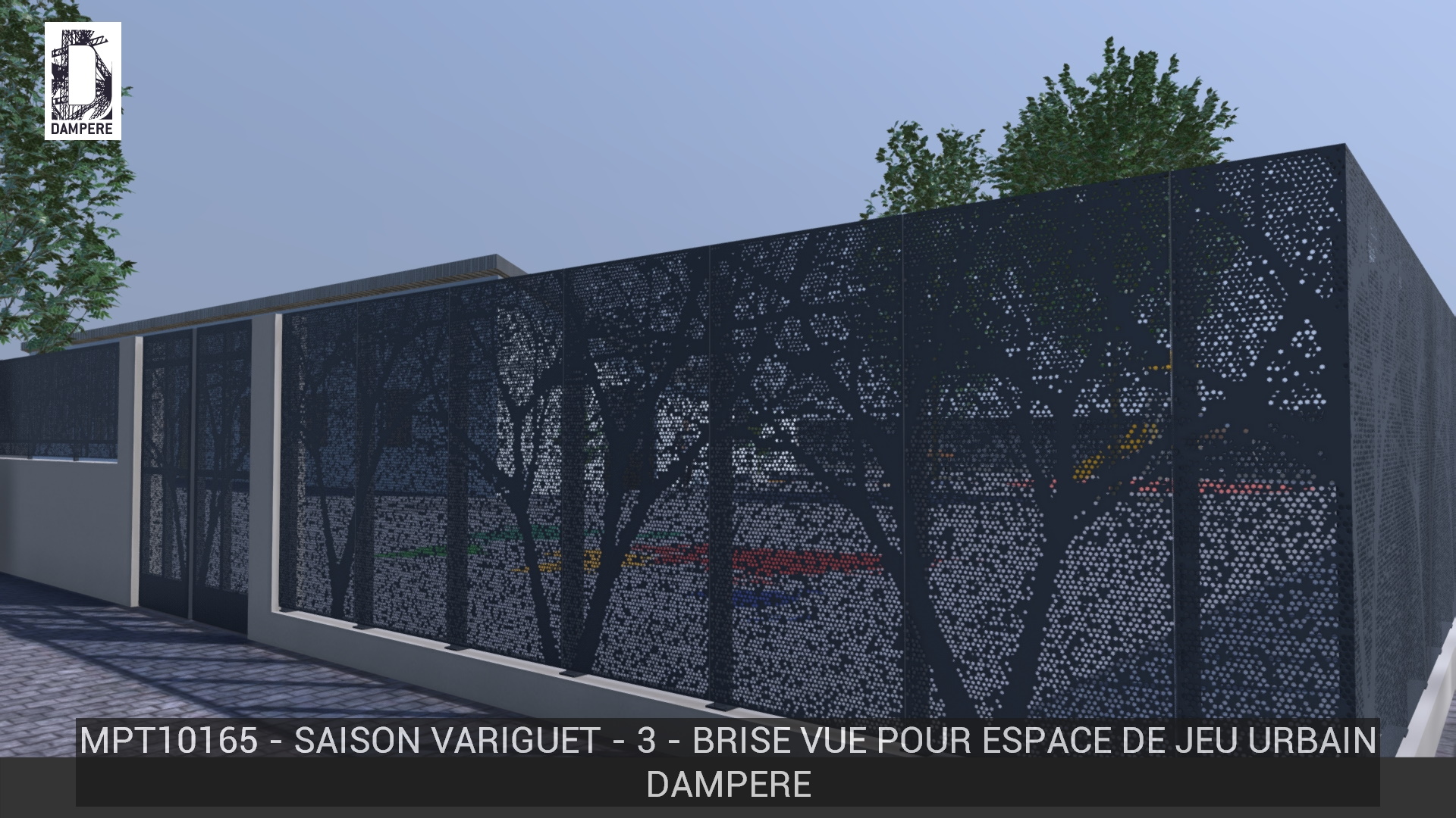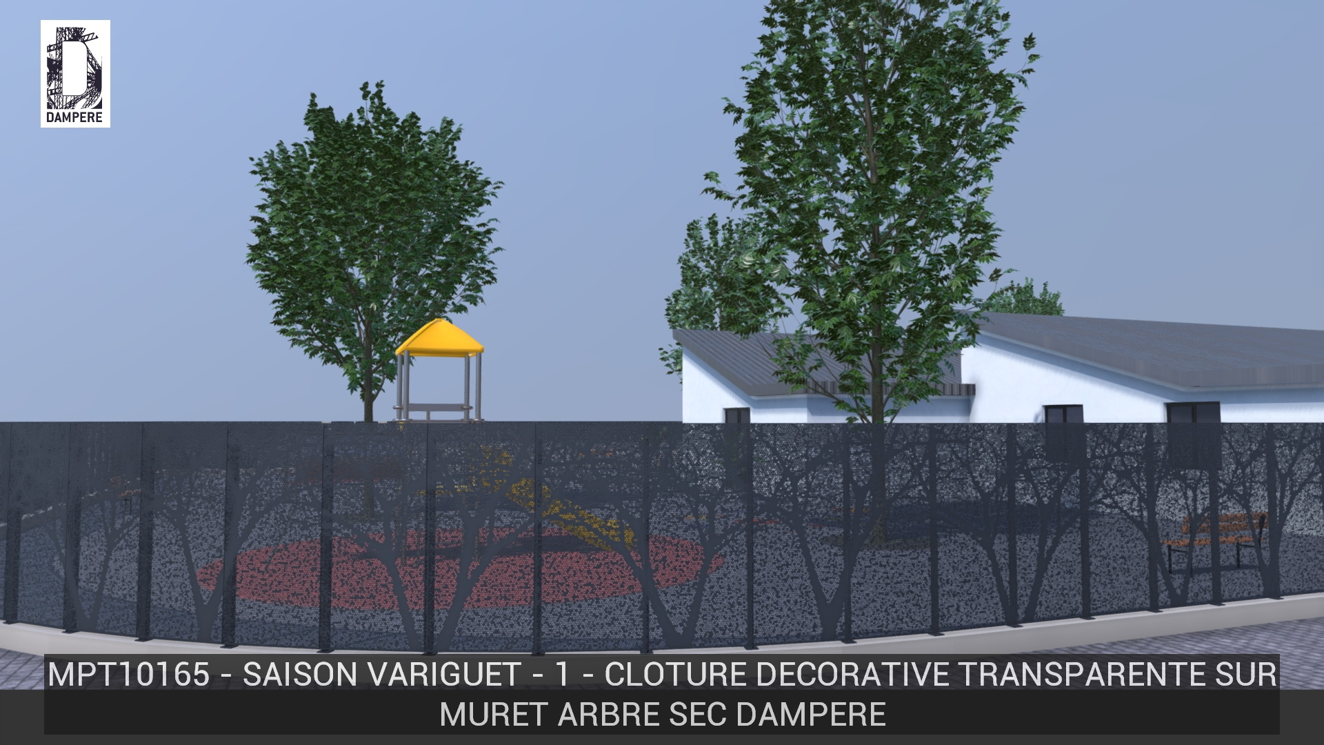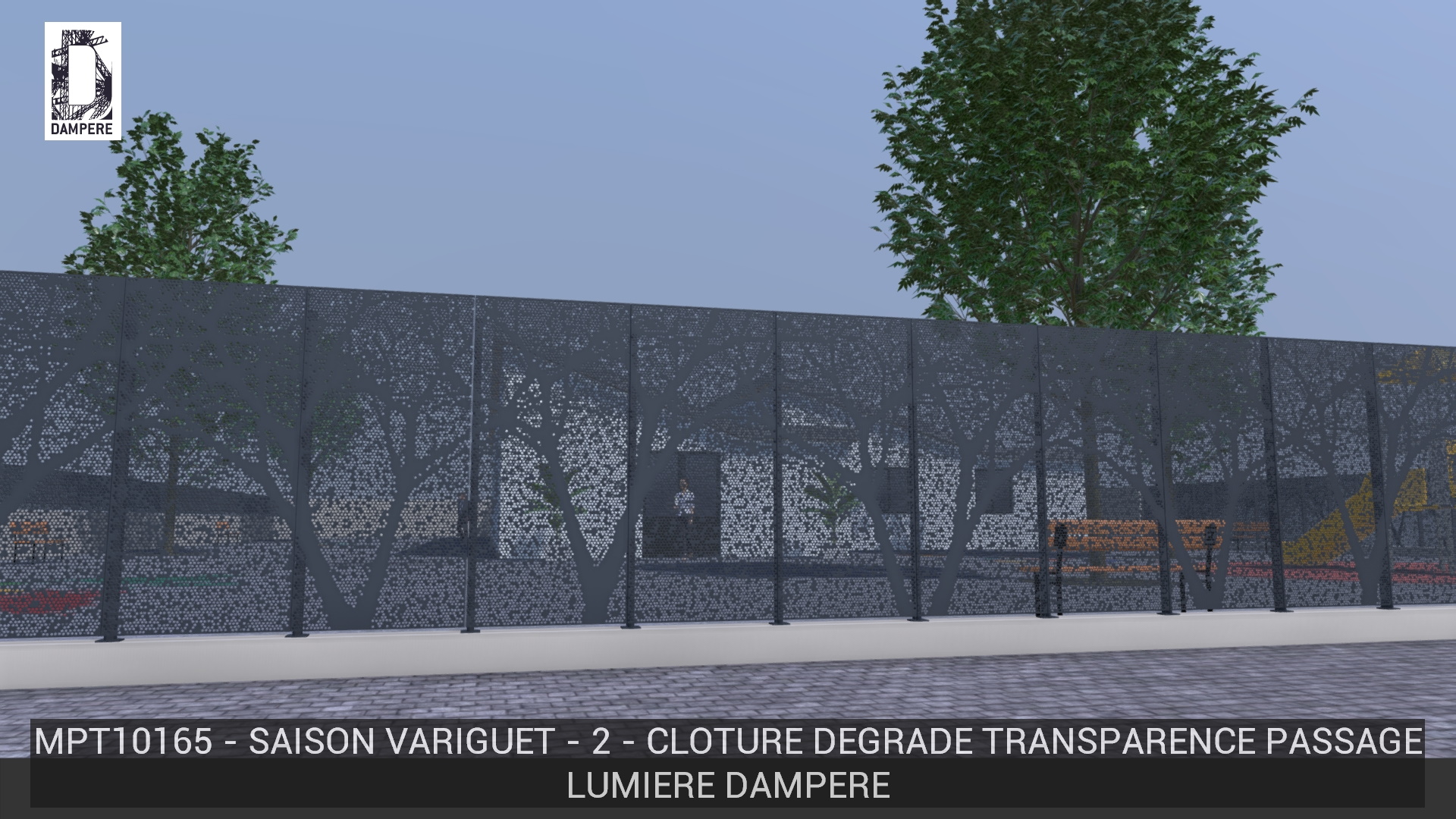 La clôture Saison Variguet de DAMPERE utilise la transparence pour illustrer la silhouette d’un arbre fortement contrastée par un tronc massif et plein. Les perforations en pentagones asymétriques créent une trame mouchetée en partie basse.