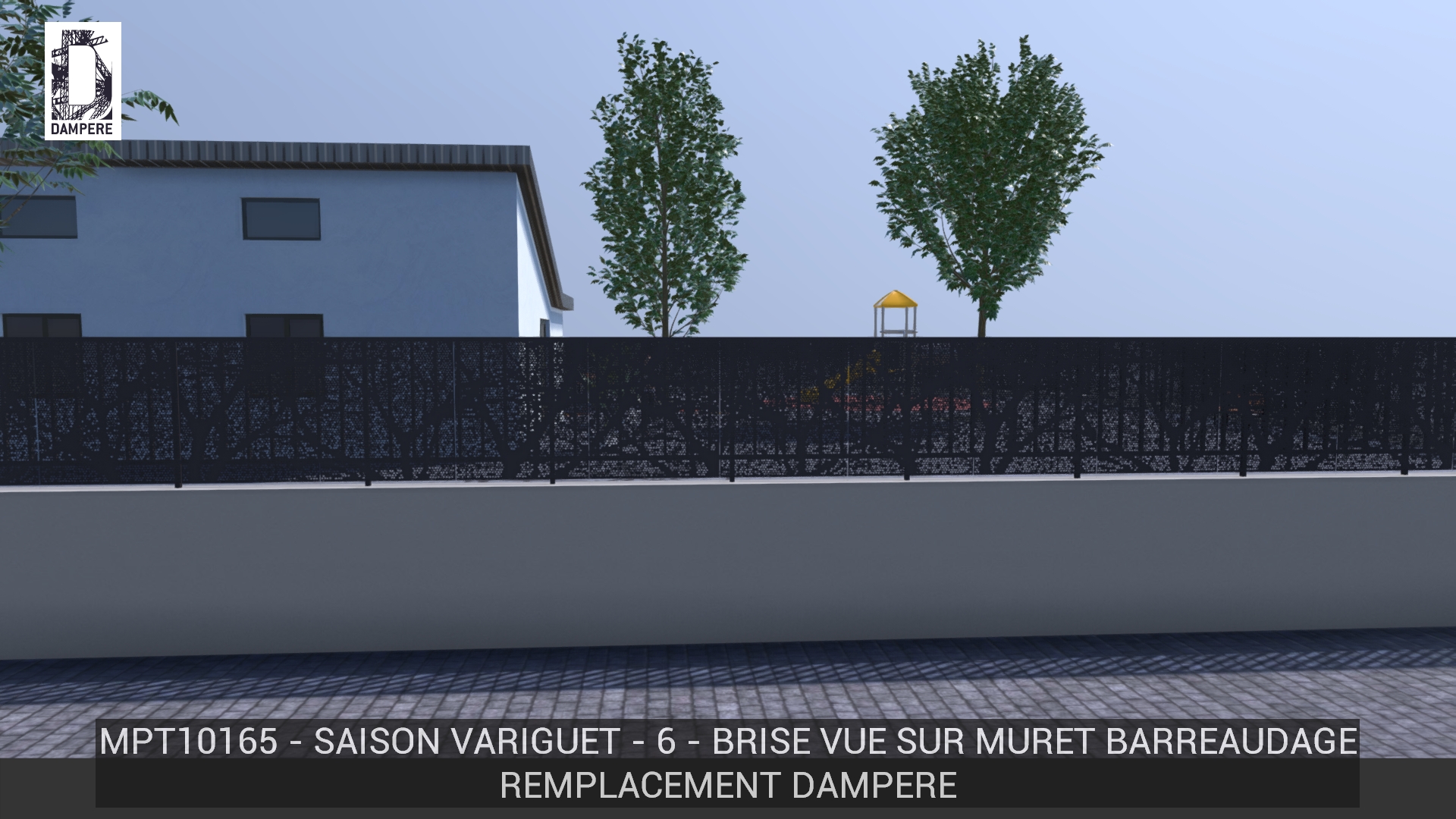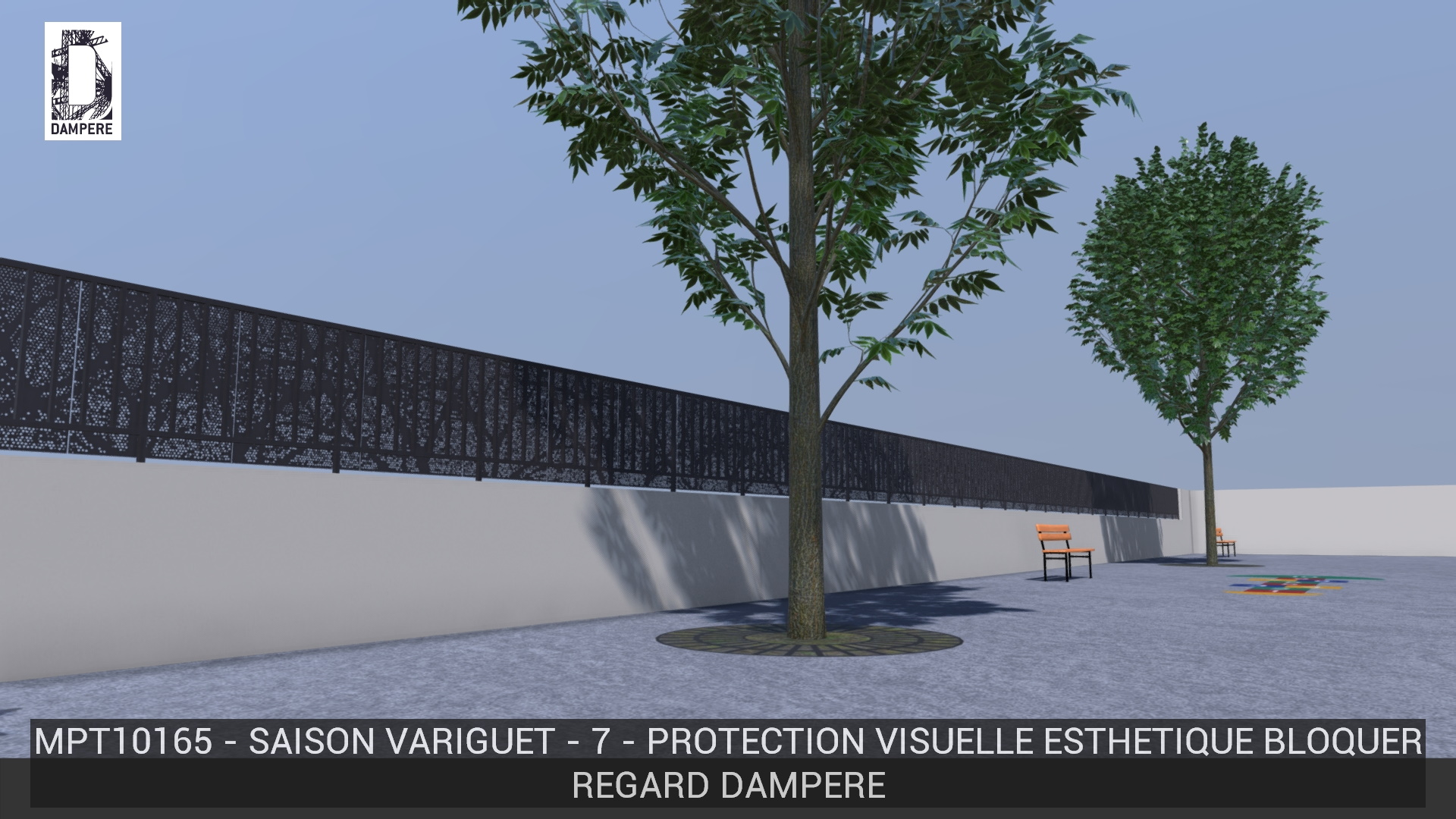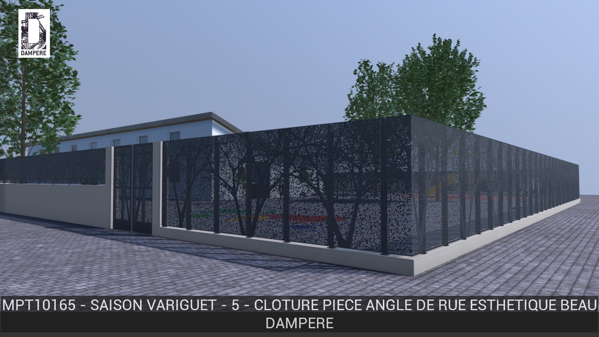 La clôture Saison Variguet de DAMPERE utilise la transparence pour illustrer la silhouette d’un arbre fortement contrastée par un tronc massif et plein. Les perforations en pentagones asymétriques créent une trame mouchetée en partie basse.